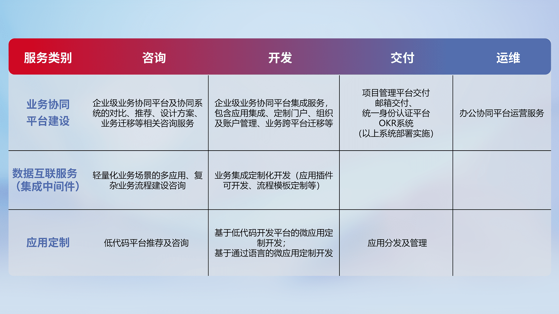针对钉钉、、、企微、、、IDaas等平台级产品提供产品的规划、、、方案、、、交付、、、定制化开发等服务,,实现如统一协同办公、、、、智能客户服务、、、、混合会议管理、、智能数据查询、、、等业务场景,,实现数字化转型。。