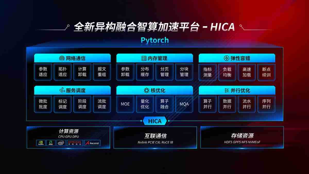通过自研的服务层、、中间适配层、、以及调度编排算法,,采用数据并行、、、、模型并行等多种并行方式,,,把并行计算任务进行有效的分解,,使其分别由相应的软件栈和算力资源来承接。。。。当GPU资源变化,,,,HICA可以实时动态调度计算子任务并调整模型拓扑和架构,,,,以充分聚合各种算力资源。。。