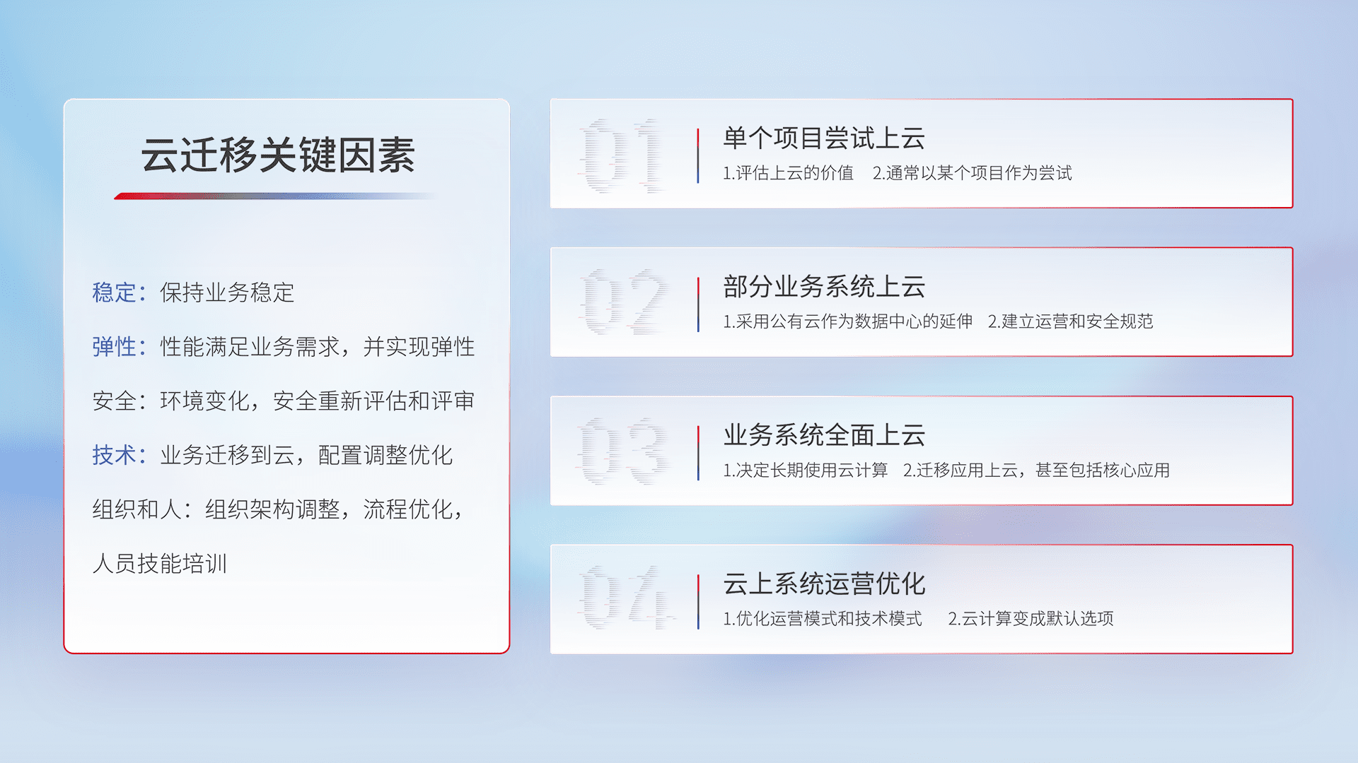 结合实际业务,,,从规划设计、、、、云平台选型、、、云原生改造、、、数据迁移、、集成交付,,,迁移全过程为客户识别最佳上云路径,,做好风险识别管理,,,,设计网络架构、、、身份权限、、、安全审计合规、、、、操作审计、、、、日志审计、、、、监控告警策略、、、、多站点容灾设计等,,,,对云上基础设施进行整体规划,,,提升IT治理水平,,,,以满足弹性、、、、高可用、、高性能的需求。。。。